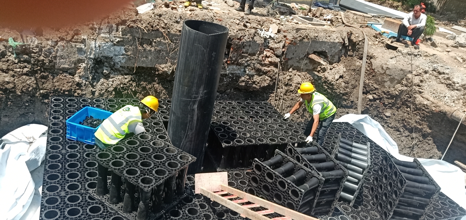 該項目雨水收集回用采用地埋PP模塊組合水池的方式收集雨水,前期經過截污掛籃、棄流過濾,后期通過地埋一體機過濾,消毒,最終使水質達到規范標準,用于區域內綠地的澆灑,景觀補水,道路沖洗等。