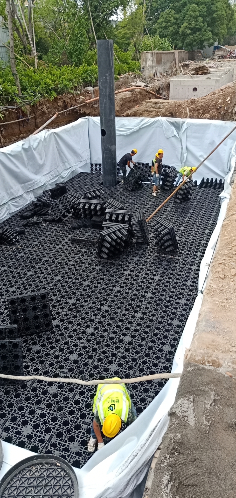 該項目雨水回收系統采用地埋PP模塊組合水池的方式收集雨水,前期經過截污掛籃、棄流過濾,后期通過地埋一體機過濾,消毒,最終使水質達到規范標準,用于廠區綠地的澆灑,景觀補水,道路沖洗。